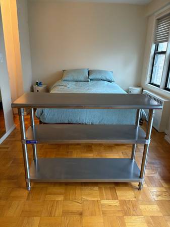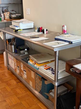 $200 CASH -Smaller Table: Measures: 48" long x 36" high x 18" deep 1-1/2" rounded edge on front & rear, flat edge on both ends, adjustable stainless steel undershelves, steel tubular legs, rounded bull nose horizontal edges, adjustable feet- $220.00 CASH .