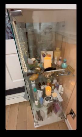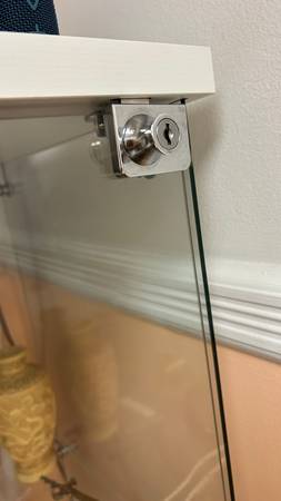 New glass showcase with 2 removable glass shelves and lock with 2 keys.