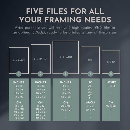 • 5 High-resolution JPEG files of each artwork — optimized for print in all standard sizes (prepared for 115 listings, extendable via Photoshop file)