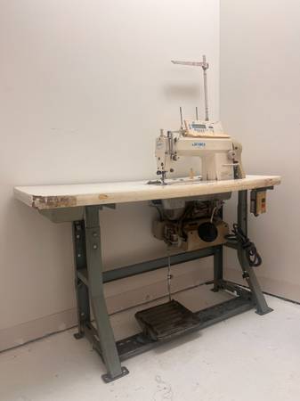 Selling a Juki DDL-5550N-7 industrial sewing machine with CP-130 digital control panel, servo motor, and table with foot pedal.