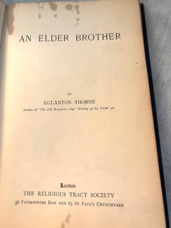 An Elder Brother by Eglanton Thorne; a pseudonym of Elizabeth Carlton ; is a first edition (1895) that is not dated in the book. Published by The Religious Tract Society, London (Butler & Tanner). This is a classic and timeless story of siblings and family dynamics. The book has an intact, though loose spine. There is yellowing and staining on the pages and cover. 128 pp