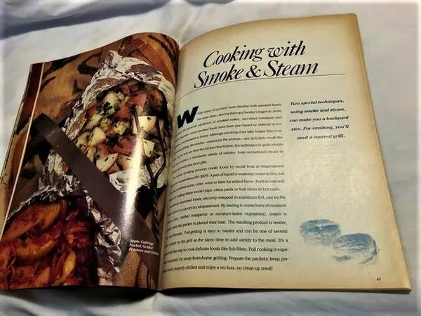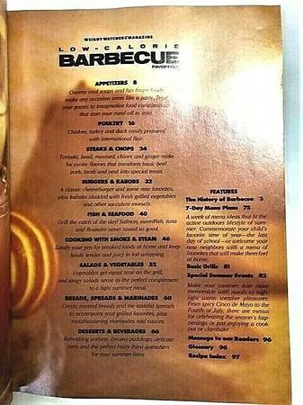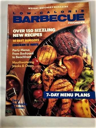Weight Watchers Magazine Low-Calorie Barbecue Favorites (1989), has recipes, charts and great illustrations. The magazine is in good condition with some yellowing of pages.