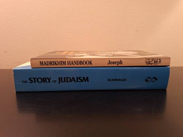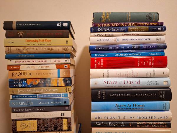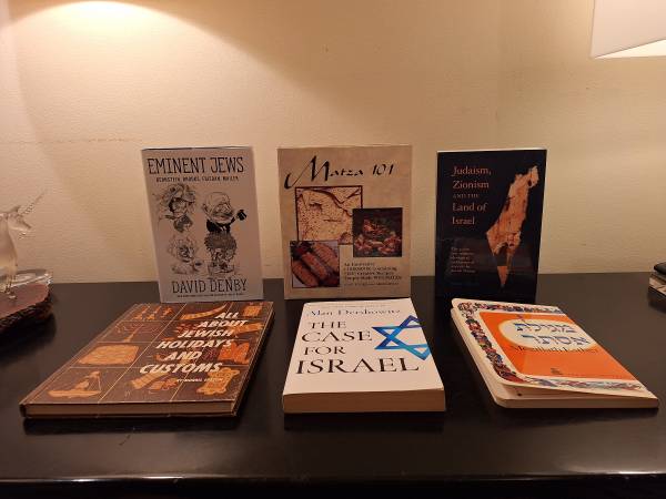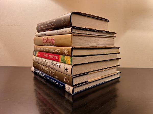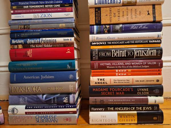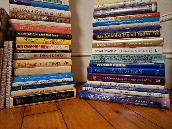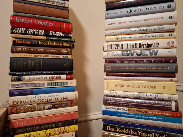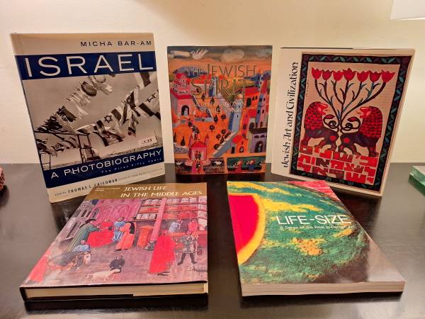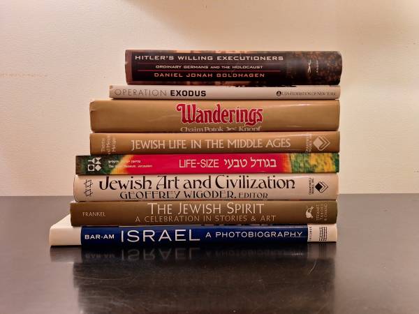 Collection of 171 books in very good condition regarding all aspects of Jewish life, history, religion, social issues, biographies, cookbooks, kabbalah & mysticism, Israel, folktales, Yiddish language studies, The Holocaust, songs, politics, philosophy, ethics, art, more...