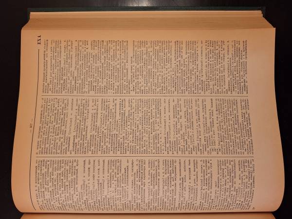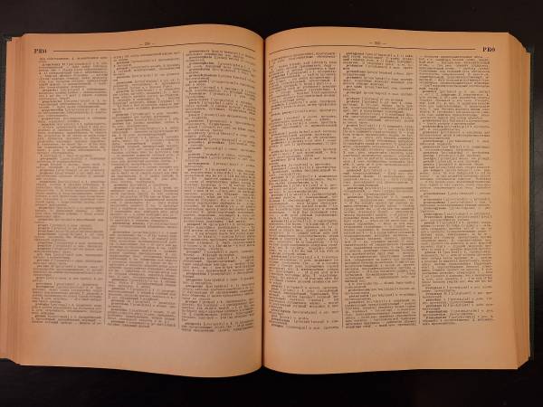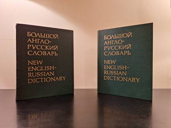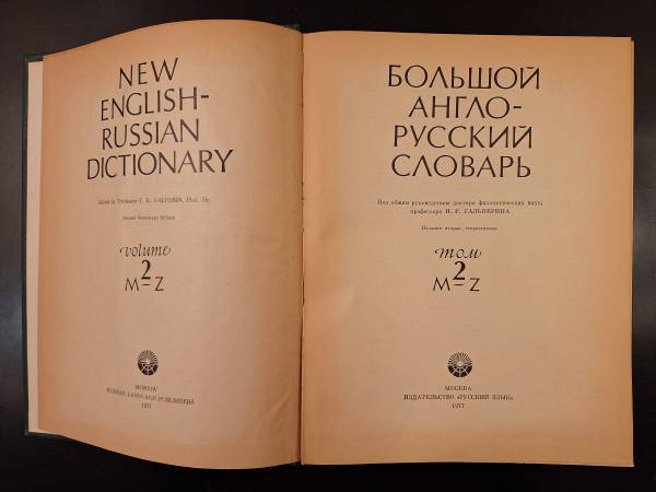 New English - Russian Dictionary Printed in 1977 in the U.S.S.R. Minor separation occuring in a few spots, but overall, binding is in nice shape. Overall very nice condition.