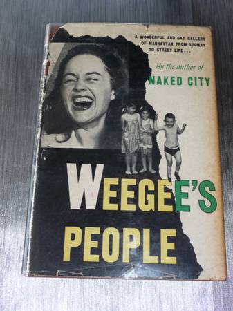 Dustjacket has wear and tears, slight staining in "W" of Weegee. Dust jacket has small tears and wear but has done its job in protecting the book. Rear panel has an irregular sized piece missing about three and a half by one inch. Spine of dustjacket has wear and chips and tears. Original price unclipped dust jacket is now protected in a protective sleeeve.