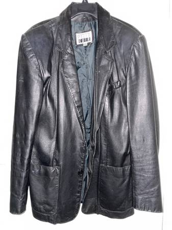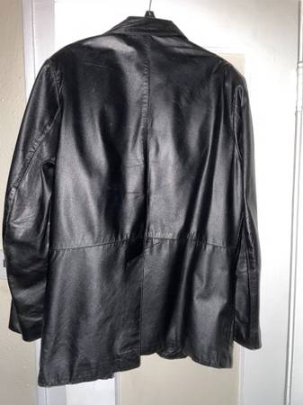 Black Dress Leather 44/46 M Mid Length. 2 Inside reinforce deep pockets leather/nylon 3/8"-Piping enforced, 2 arm length pockets Breast pockets reinforced Exterior, LINING: Left ARM tear, Repairable: YES Inch:6 -10. No other noticeable: Leather: No tears or worn sections. Linin/Leather; Professional Cleaning Recommended. $150 OBO