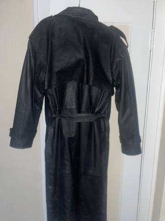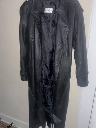 Black Leather 44 to 48 M with built on petticoat, Shoulder and Cuff Double button Straps, Double Breasted, Deep Inside Breast pocket, Zip in out Nylon lining. Insulated Acetate 50/50 Nylon Twill...