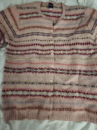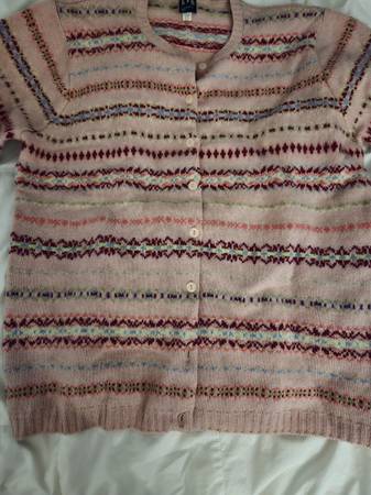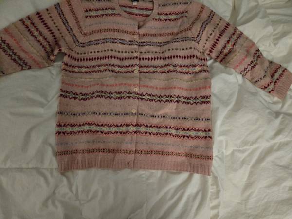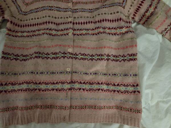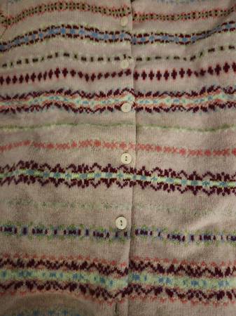 New. Lake Isle multi colored printed sweater, 7 button pearlized button. 100% Lambswool. Cash and pick up only.