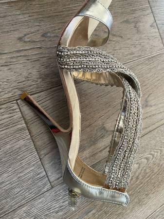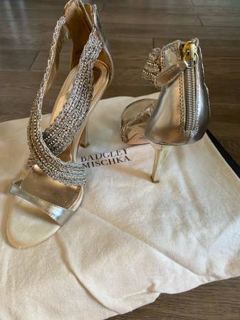 Size 7 elegant Badgley Mischka metallic light gold sandals. 4.5 inch heal worn only once for a wedding and purchased at Neiman Marcus. In excellent condition with original box and bag included.