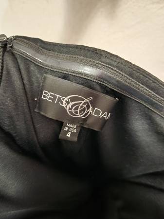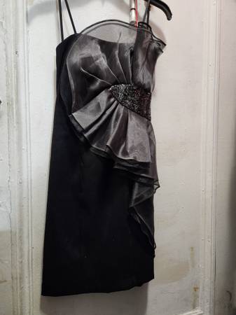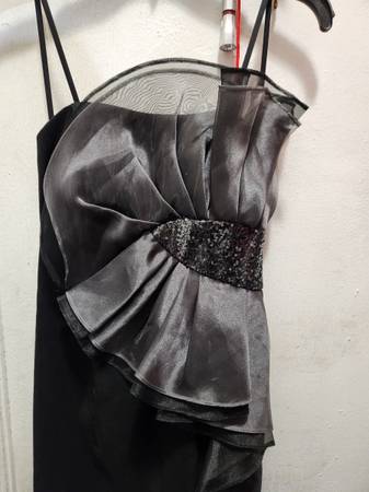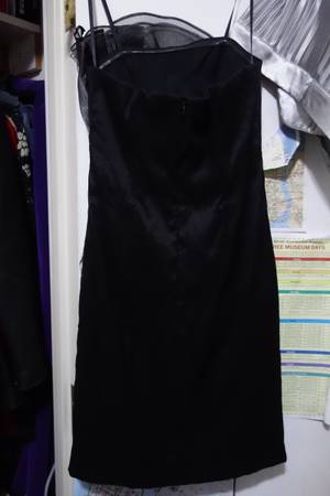 Like new (worn once). Black minidress (29" from neckline to hem), approx. 32" bust. Stretch material allows for some wiggle room on sizing and a flattering, bodycon fit. Polyester/nylon/spandex fabrication looks and feels like stretch taffeta. Hidden back zipper. Would make an excellent prom dress.