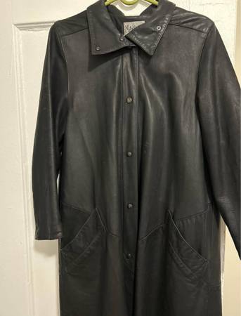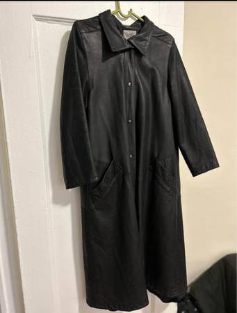 Long Black soft, smooth Leather Coat for sale. NO holes or smells. No buckling or bubbling. A section of the lining dropped two inches, easy fix. I’m in Washington Heights. Size Medium. Ideal for person under 5’8”. Selling because sleeves are too short for me.