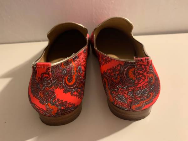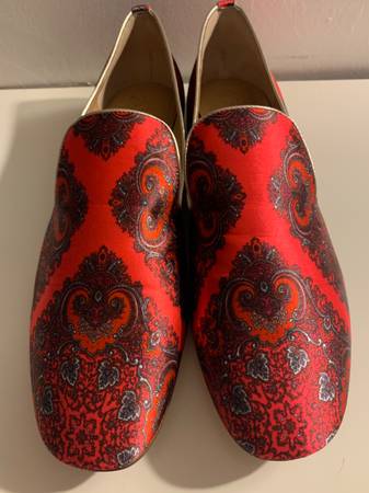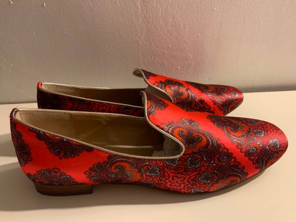 Brand new, red paisley, sateen loafers, flat shoes, smoking slip ons w/ gold edge trim.