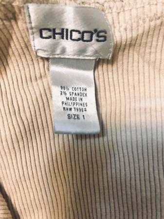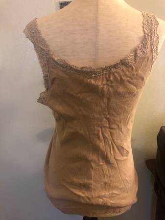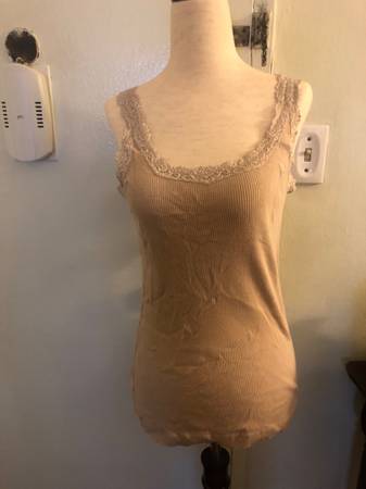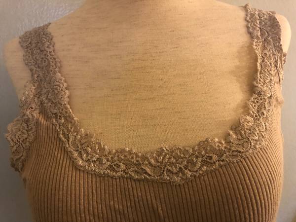 Chico's oatmeal-colored tank top with lace, size 1 (approximately 26" long from top of strap to bottom, 16" from armpit to armpit),98% cotton, 2% spandex, barely-worn.