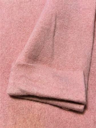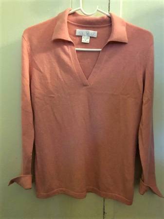 Bloomingdale's pink cashmere sweater, size small with V-neck, collar and cuffs, has some pilling and a small hole near the hem on the front