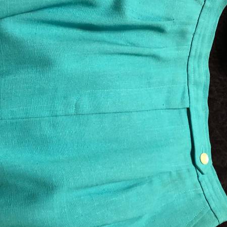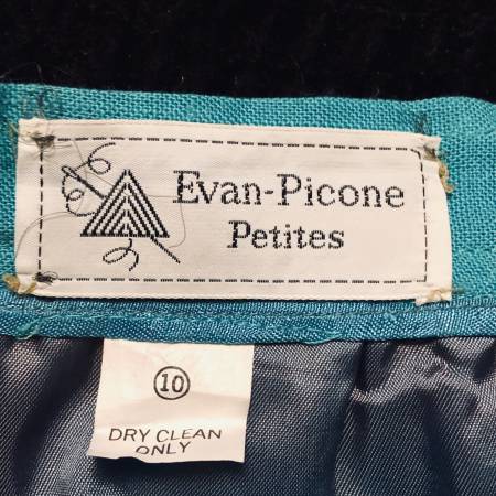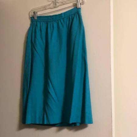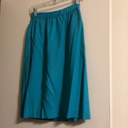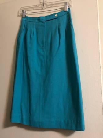 Vintage Evan Picone turquoise straight skirt, petite size 10 (approximately 26" waist, approximately 25 3/4" length), fully lined with 2 side pockets and 2 front pleats, has a few minor pulls