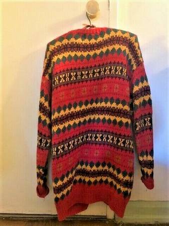 Vintage hand knit Jones New York red, green and yellow cardigan, size M, made of ramie and cotton, good condition with a few pulls