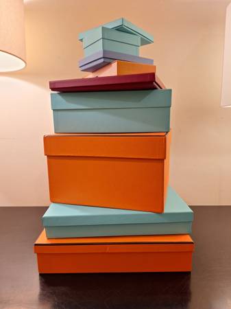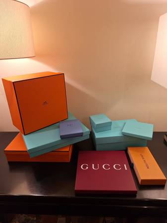 Collection of 9 luxury boxes being sold for the price of $20. $20 = 9 boxes. 2 Hermes 4 Tiffany 1 Gucci 1 Louis Vuitton 1 Smythson Clean and good condition. A couple creases & marks here and...