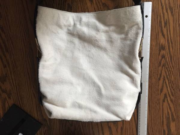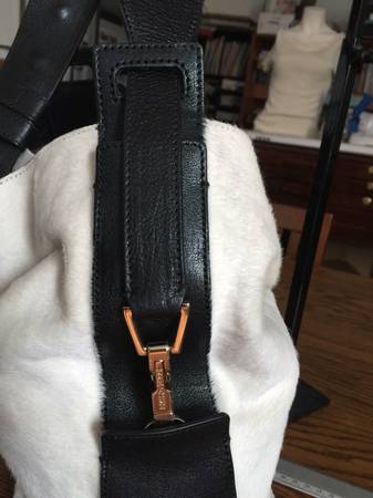 This is a very eye catching and light-weight practical bag. White ponyskin with black calf leather details. Interior in purple microfibre. Can be worn crossbody or over shoulder by shortening the clever and uniquely designed invisibly adjustable strap, and dual height rings for strap clasps.