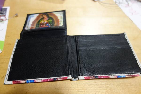 Beautiful painted iconic Virgin Mary portrait on a bi-fold leather wallet. Vibrant Frida Kahlo-style depiction of the biblical figure. LOTS of card sleeves,two i.d. windows and divided cash insert....