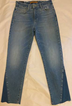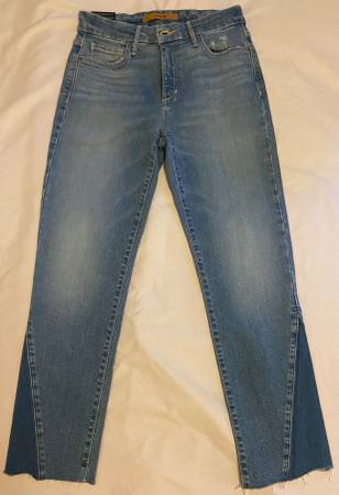 Crafted from a blend of polyester, spandex, and cotton denim, these jeans boast a comfortable and stretchy fit that is perfect for any season. The button, zipper, and logo accents add a touch of style to the classic blue color. With a waist size of 26 inches and inseam of 28 inches, these jeans are a great addition to any wardrobe. Light distress o left pocket. Leather tag on rear pocket. Detail on ankle! Insert of darker color denim wedge.