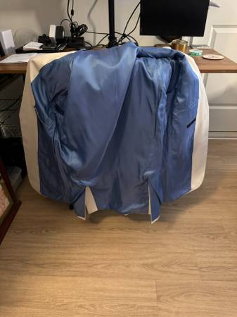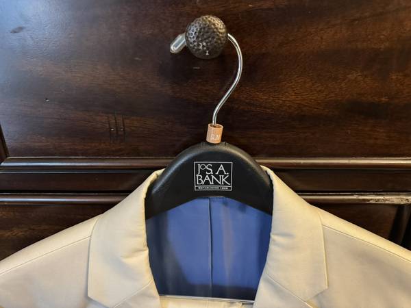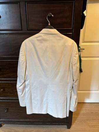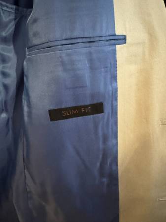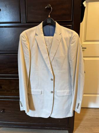 Worn Once! Just too small even with tailor. 42R. Light blue inside. I needed a long but really wanted for an event. Never worn since. Will deliver or meet in Manhattan for $15. Slim Fit. Includes hanger. Confirmed 100% Jos. A Bank. Great summer suit.