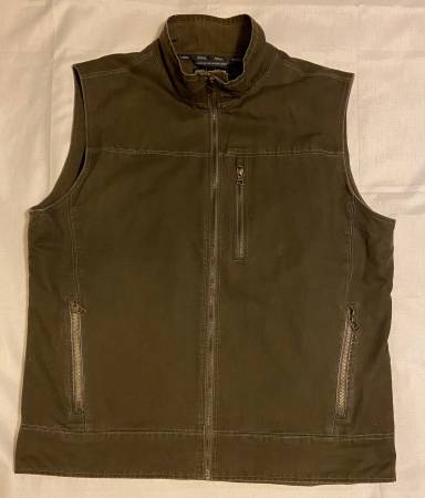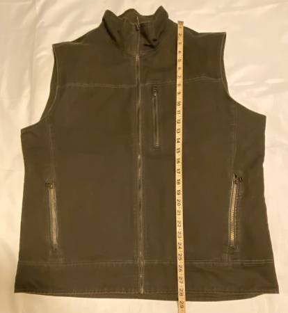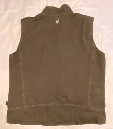 The Kuhl Burr Vest in XL size is a rugged outdoor garment perfect for work, travel, or casual wear. Made of polyester with a fleece lining, this full-zip vest features a stand-up collar, zipped pockets, and a waterproof design. The green patina dye adds a unique touch to the limited edition piece, making it ideal for outdoor activities like hiking and hunting in winter, fall, or spring. With its quality construction and attention to detail, this Kuhl vest combines style and functionality for the modern outdoorsman.