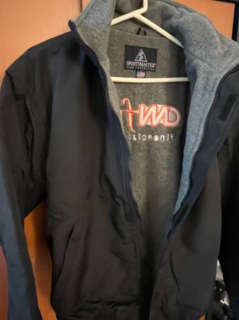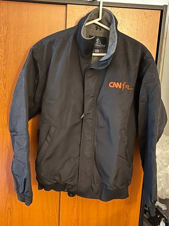 Men's black bomber jacket with CNNfn logo Water resistant shell Grey fleece lining Velcro front closure Size - L (CNNfn former financial/business channel of CNN) Pick up upper east side Cash only