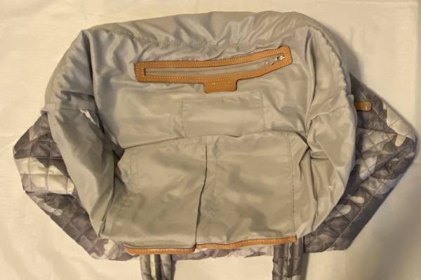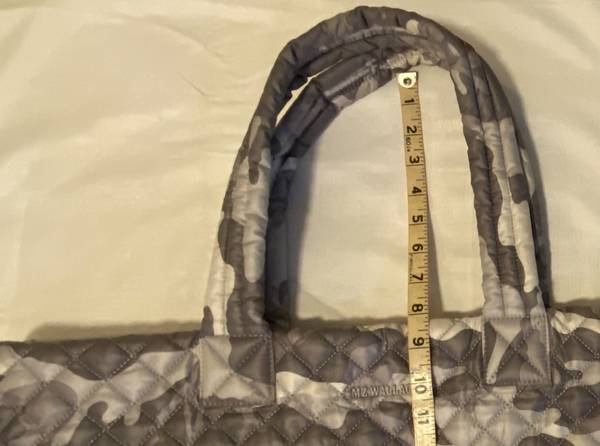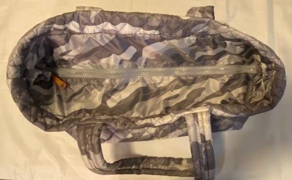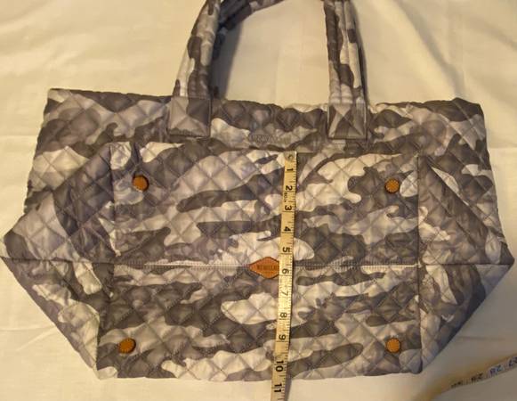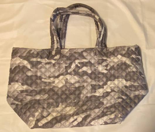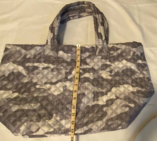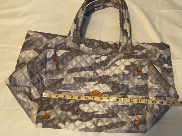 The MZ Wallace Large Light Gray Camo Oxford Metro Tote Bag is a stylish and practical choice for women on the go. This tote features a trapezoid shape with a zip closure and double handles in a matching gray color. The exterior is made of durable nylon material with a quilted finish, giving it a unique and sophisticated look. With plenty of inner pockets and a key holder, this bag is perfect for travel, workwear, or business occasions. Its spacious size and lightweight design make it a versatile option for everyday use.