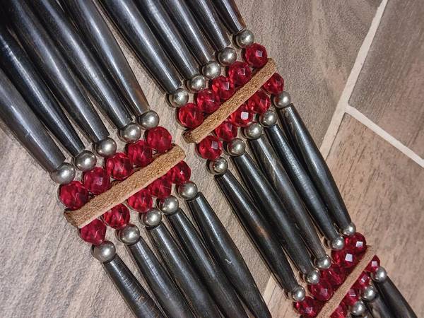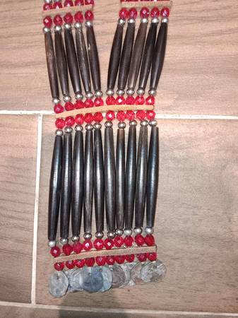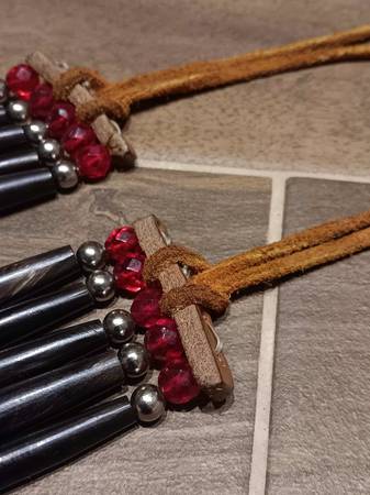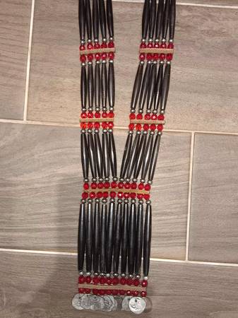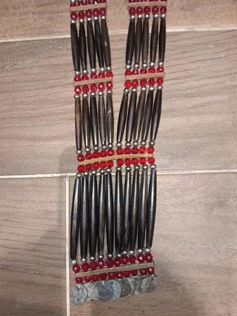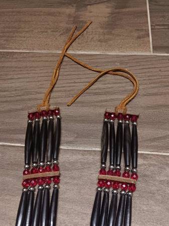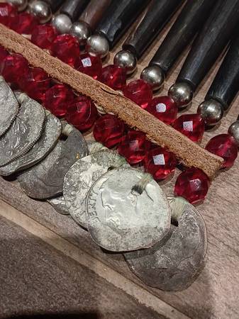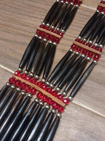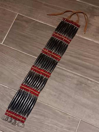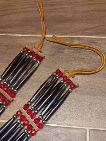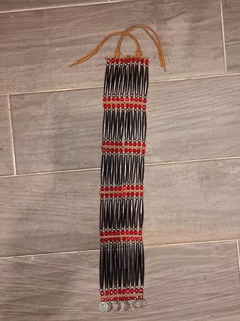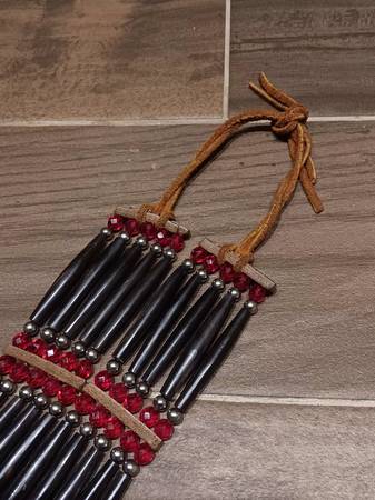 Native American Buffalo Horn Breastplate - Necklace (Hair Pipe , Handmade) ... accented with red glass beads - silver beads - 10 'flattened' vintage dimes at the base with all being strung through leather straps "Very Well Made" . It's 19" in length - excluding leather ties , 3 1/2" in width - across base . It's a beautiful piece that can be worn or displayed nicely as artwork ??...at just $50 (Worth FAR more than asking price !)