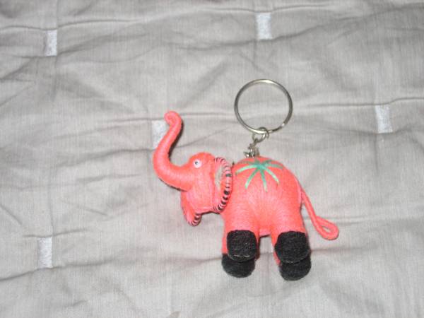 This keychain is about 2" wide and 2.5" high from trunk to feet. It was made in Thailand. I am located in East 80s.