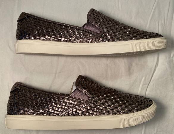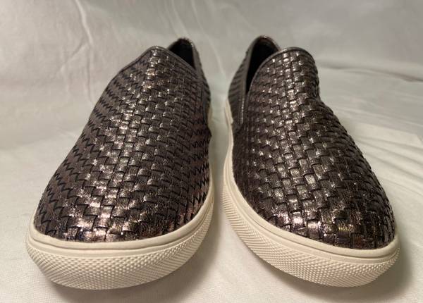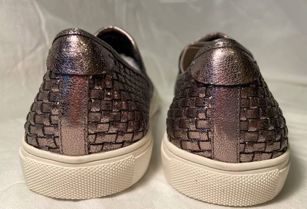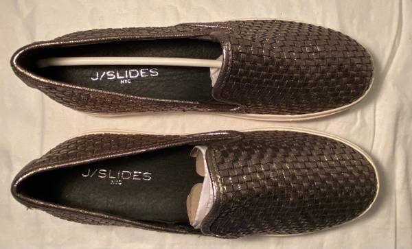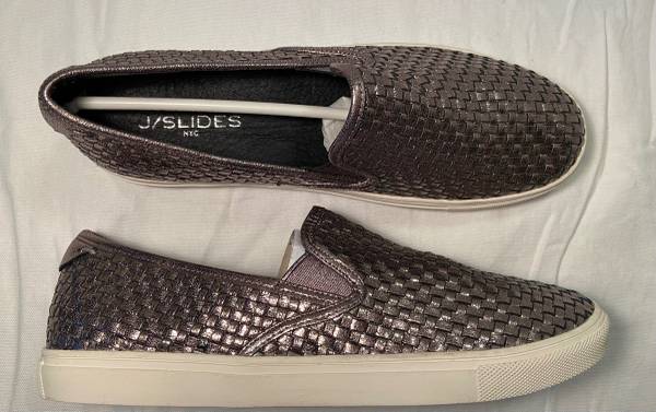 The NEW J/SLIDES Bronze Mesh Woven Shoes are a stylish and versatile option for casual or elegant occasions. Featuring a round toe shape, slip-on closure, low heel, and metallic leather weave accents, these loafers offer comfort and a touch of sophistication. The bronze color and woven pattern add a trendy twist to the classic sneaker style, making them perfect for year-round wear. Made with leather upper and lining materials, these shoes are durable and comfortable for walking or everyday wear. Add a chic and easy-to-wear option to your footwear collection with these J/Slides loafers.