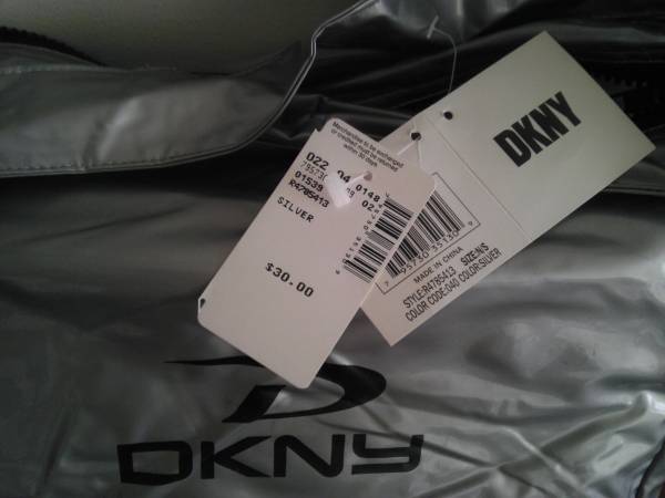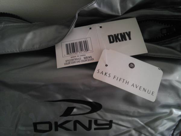 Size N/S (fits all) Never worn, excellent condition silver rain coat/poncho/slicker by Donna Karan New York. Conveniently folds into included matching carrying bag.