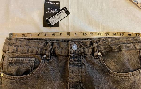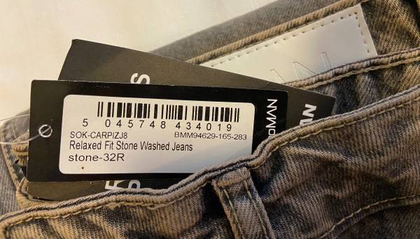 The product is a pair of NWT Boohoo Man Mens Relaxed Stone Wash Jeans with a button fly. These jeans are a stylish and versatile addition to any man's wardrobe, featuring a comfortable and breathable design perfect for year-round wear. Made from 100% cotton denim, these wide-leg jeans have a mid-rise waist and a 5-pocket design for added convenience. The stone wash color gives them a unique and casual look, while the relaxed fit provides all-day comfort. Ideal for any season, these easy-care jeans are a must-have for the fashion-conscious man.