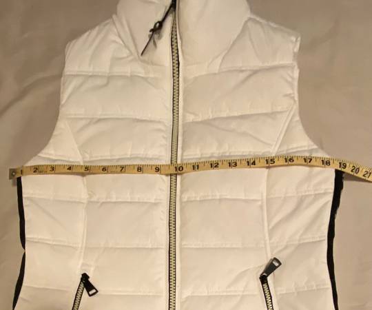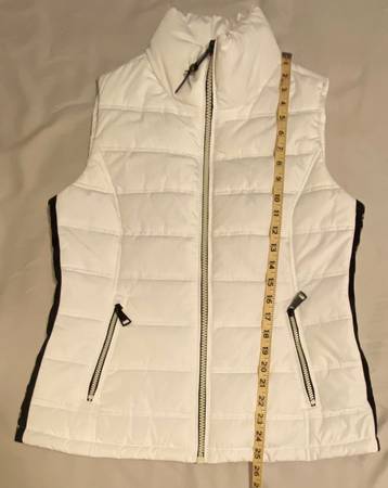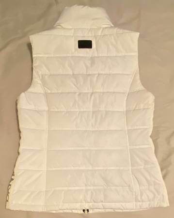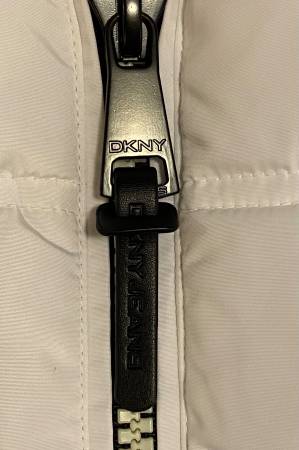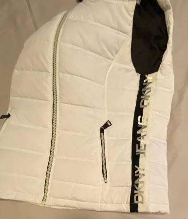 This NWT DKNY Jeans Puffer Vest in white with black logo accents on the sides is a stylish and versatile addition to any woman's wardrobe. Made from durable nylon with a cozy polyester lining, this sleeveless vest features a zip closure and comes in a size S/M. Perfect for travel, casual outings, workwear, or business attire, the quilted design adds a touch of sophistication. The classic fit and collar give it a timeless appeal, while the outdoor and sports themes make it perfect for the winter, fall, or spring seasons.