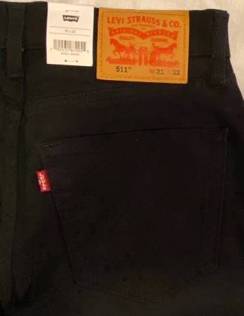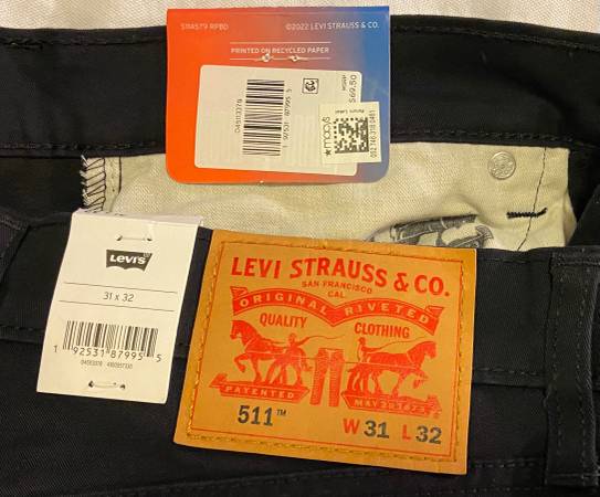 The product is a pair of NW! Levi's 511 Jeans in Men's size 31x32, featuring a Black Slim Fit with All Seasons Tech Stretch. They are crafted from a blend of Polyester and Cotton, offering a comfortable and stretchy fabric for year-round wear. The jeans are designed with a Tapered style, 5-Pocket Design, and a mid-rise waist for a modern and stylish look. With a classic button and zipper closure, these Levi's 511 jeans are machine washable and versatile for various seasons and occasions. The brand's iconic logo and accents add a touch of personality to this wardrobe staple.
