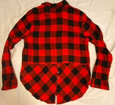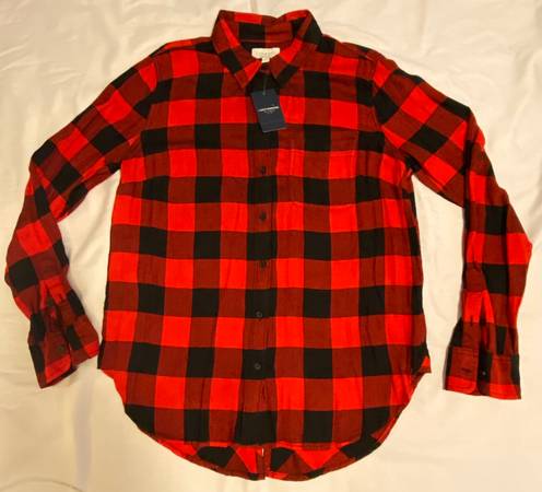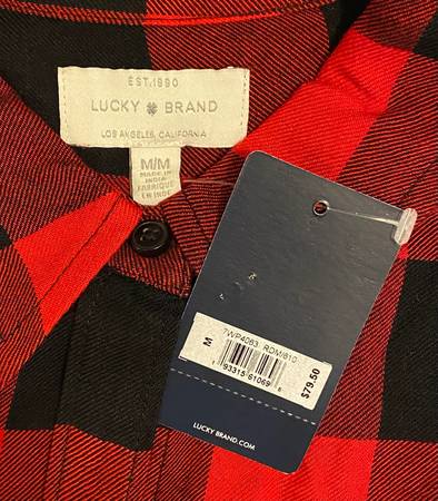 This Lucky Brand Women's Red Buffalo Plaid Long Sleeve Shirt with a split button back is a stylish and versatile addition to any wardrobe. Made from a blend of modal, viscose, and cotton, this tunic-style top features a collared neckline, button-down closure, and raglan sleeves. Suitable for various occasions including travel, casual wear, work, and business meetings, this shirt is easy to care for and suitable for all seasons. The red and black buffalo plaid pattern adds a touch of classic American style to the garment, making it perfect for a variety of themes from retro to modern.