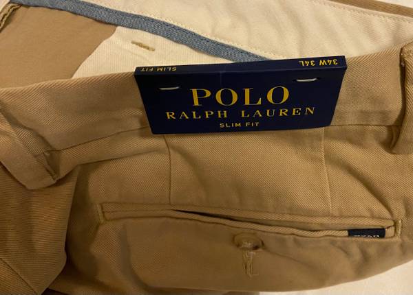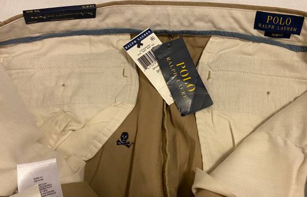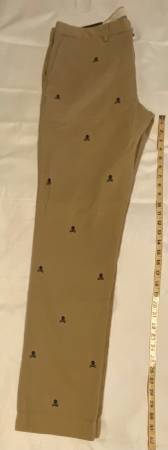 The product is a pair of Polo Ralph Lauren Men’s Rugby Chino Khaki Skull & Crossbones Pants in size 34x34. These pants feature embroidered skulls and crossbones all over, making them a stylish choice for casual or workwear occasions. The lightweight and breathable knit fabric, along with the comfortable mid-rise and slim fit, ensures that these pants are suitable for year-round wear. With a flat front design and slash pockets, these pants offer both style and practicality for the modern man