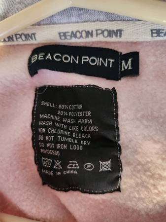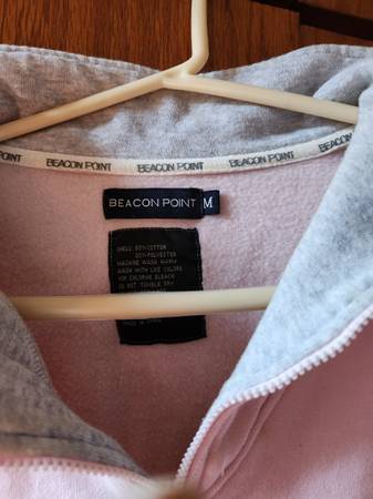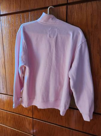 Light pink sweatshirt Size medium Long sleeves 3/4 zip collar lined in grey Hand warmer center pocket.. Great clean condition.