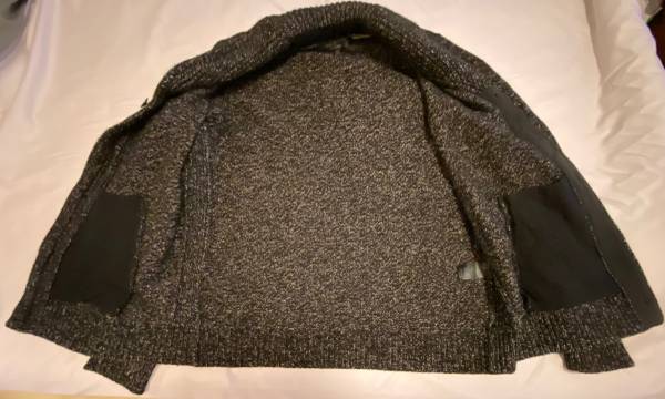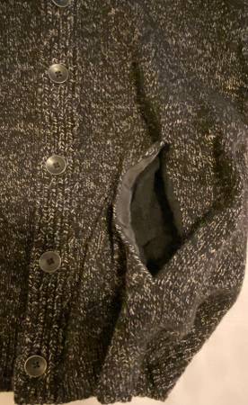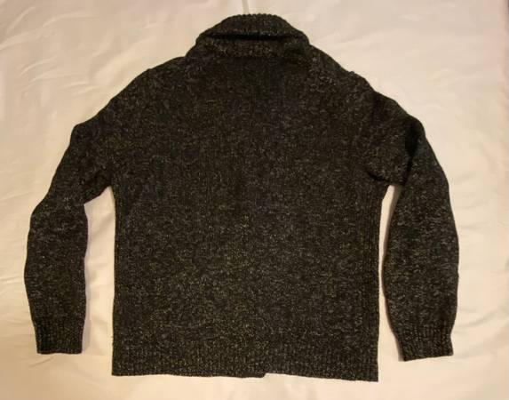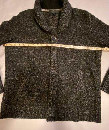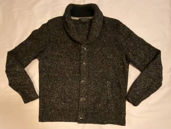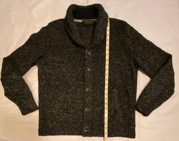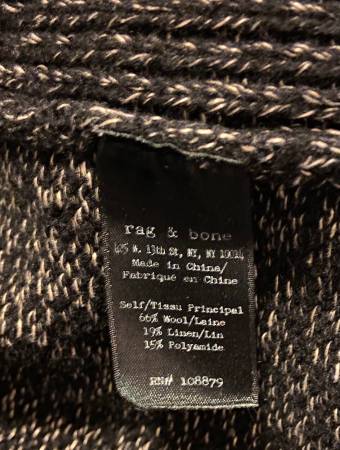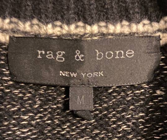 This Rag & Bone men's medium black and white cardigan is a stylish and versatile addition to any wardrobe. Made from a wool blend, it features a high neckline, long sleeves, and a shawl collar for added warmth. The tight-knit fabric makes it perfect for casual occasions, and its solid color and classic cardigan style make it a timeless piece. With a regular fit and pockets for convenience, this sweater is perfect for all seasons and activities, whether it's riding, walking, skateboarding, or hiking. Made in China by the renowned brand rag & bone, this sweater combines comfort and style effortlessly.