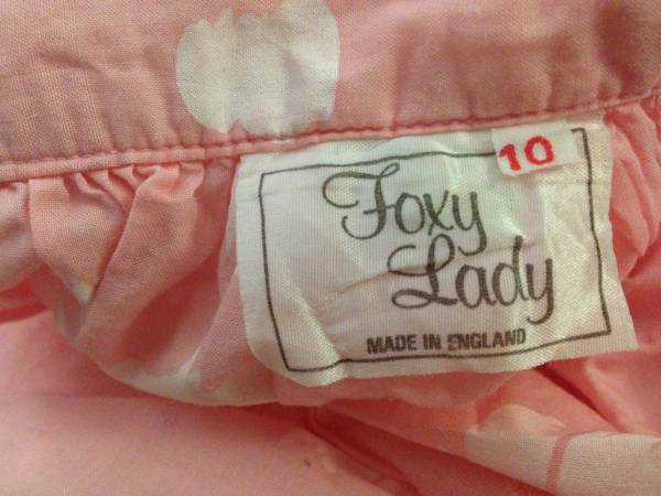 Made in England. 100% Cotton. Two shades of pink - pink background against which are scattered flowers in very palest pink. Two side pockets, 2" waistband, back zipper & button closure, 2 inner hanging ties and even still has the spare button sewn into the tag! Tagged size 10, though that's British sizing from the 70s and equates to about a U.S. size 6. Waist 24"; Hips, full but to hang properly hips should be approximately 36"; Length 29" from top of waistband.