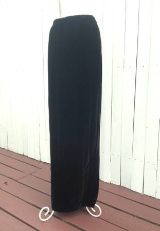 JULIE DUROCHE for Saks Fifth Avenue After Five. ILGWU (International Ladies Garment Workers Union) tag - MADE IN USA. Vintage 1980s. Floor-length Skirt. Silk velvet - fully lined. Back zipper with metal catch. Fully lined. Waistband contains about 6 inches of elastic in back so waist stretches from 24 to 26. Tagged size 8: Waist 24 - 26", Hips 36", Length 43". This is a classic and elegant wardrobe staple that will never go out of style. Excellent Vintage. $40