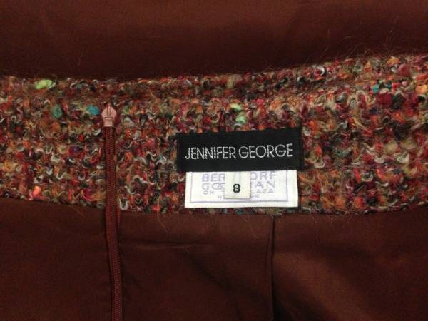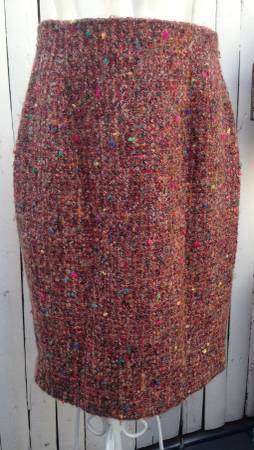Jennifer George label. 70% Acrylic, 20% Mohair, 10% Wool. Nubby Tweed. Multi-colored: Brown, Rust, Orange, Blue, Green, Pink, Gray, Black, Turquoise, Yellow, Gold. Fully Lined, Hidden Back Zipper, Slightly High-Waisted. Tagged size 8 - Waist 26", Hips 38", Length 23". Perfect New Without Tags Vintage. $35