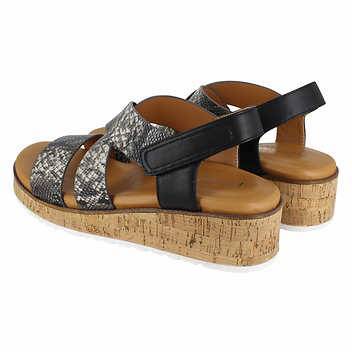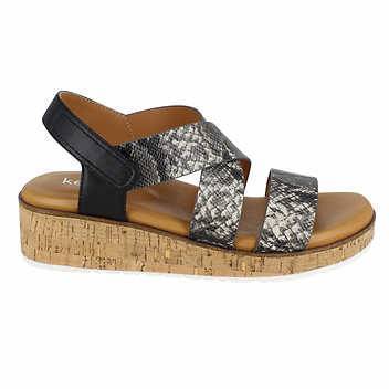 Brand new with a box. Kensie Ladies' Wedge Sandal Wedge Sandal Self Fastener Closure Padded Insole Colors: Black (Black Snake) and Tan (Tan Natural White) Cork wrapped wedge heel Self-fastener strap...