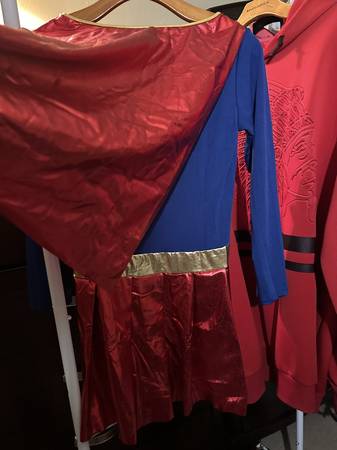 Selling an adult Supergirl costume! It's a size M. The costume is red, blue, and gold.