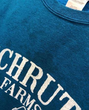 The Office ‘Schrute Farms’ Bed & Breakfast Dwight funny television character Beet vegetable logo oversized sweatshirt, color is blue with front graphic. Preowned condition *front discoloration...