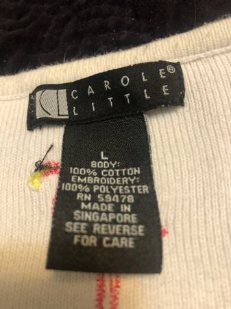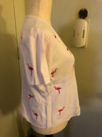 Vintage Carole Little cotton sweater with flamingoes, size L (21 1/4" long, 20" from armpit to armpit), has faint stains