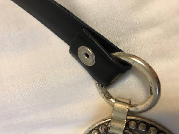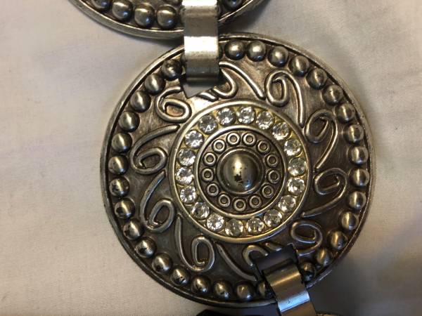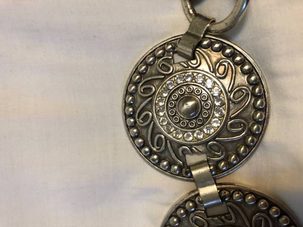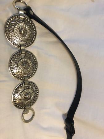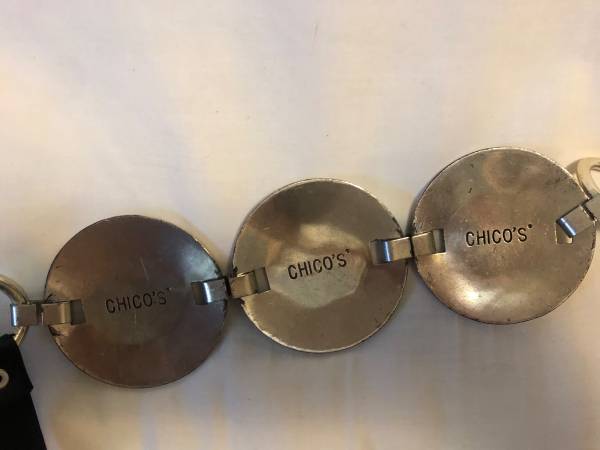 Vintage Chico's leather, silver and rhinestone adjustable belt. The belt is 36" long with the silver medallions being 2 5/8" in diameter. The medallions have rhinestones. The belt is a size small. It does have some tarnish otherwise; it is in good condition.