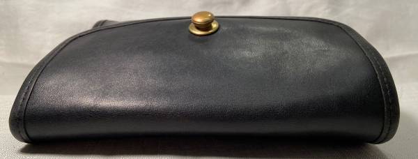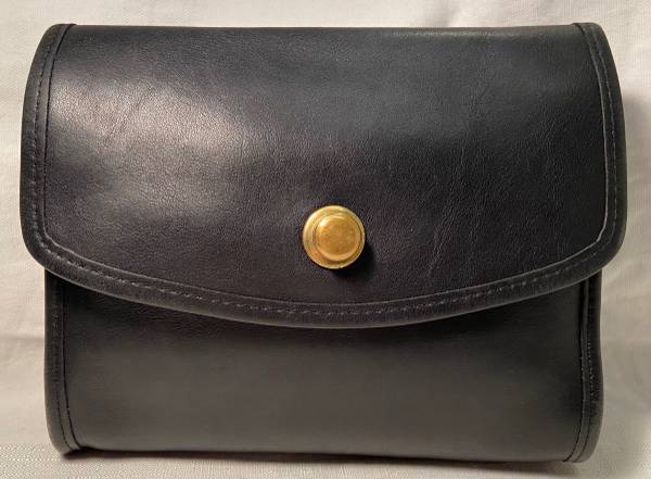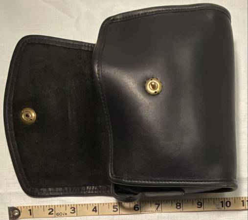 The Vintage Women's Coach Chrystie Black Leather Crossbody Shoulder Bag is a classic and stylish accessory for any occasion. Made in the USA with high-quality leather, this small square bag features a zip and snap closure, brass hardware, and a black leather crossbody strap. With inner pockets for organization and a lightweight design, this limited edition bag is perfect for travel, weddings, parties, casual outings, formal events, workwear, and business meetings. The matte black exterior with zipper accents adds a touch of sophistication to this timeless piece from Coach's Chrystie collection.