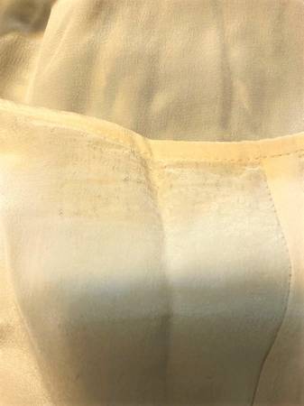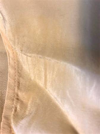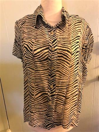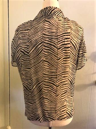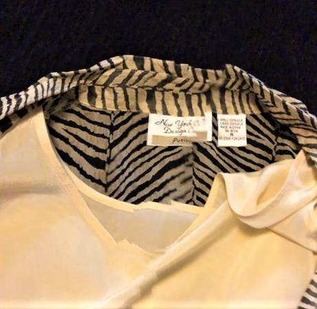 Vintage New York City Design Co. zebra striped silk blouse and tank, size petite M. The blouse is 25 1/4" long and 22" from armpit to armpit. It has an attached tank to it. The tank has 1 small stain near the bottom and pulls near both armholes. It has been dry-cleaned.