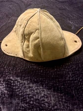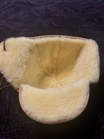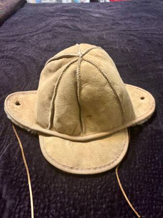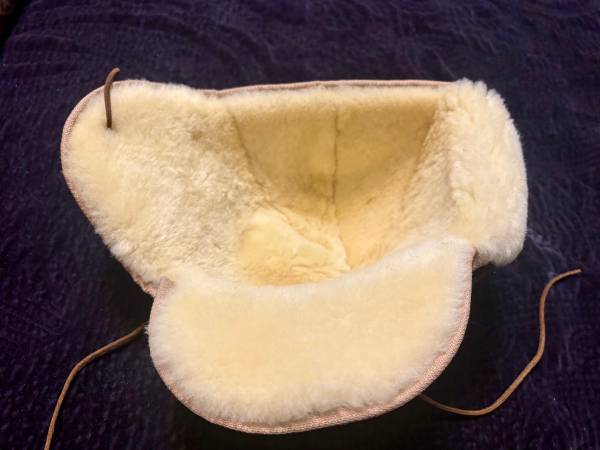 Vintage shearling hat with ear flaps and leather tie. This hat was purchased in New Zealand and barely worn. It has a couple of marks on it. It is probably a women’s size S. It is very warm.